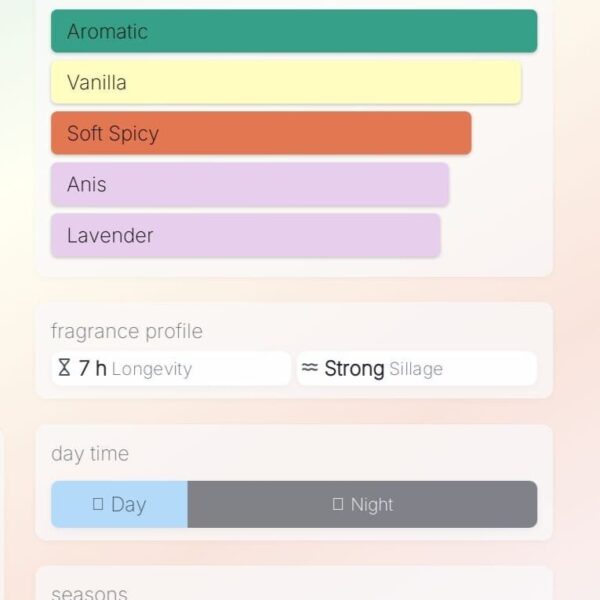 Main accords – vanilla,rum,sweet,tropical,fruity,white floral,powdery,musky,woody,fresh