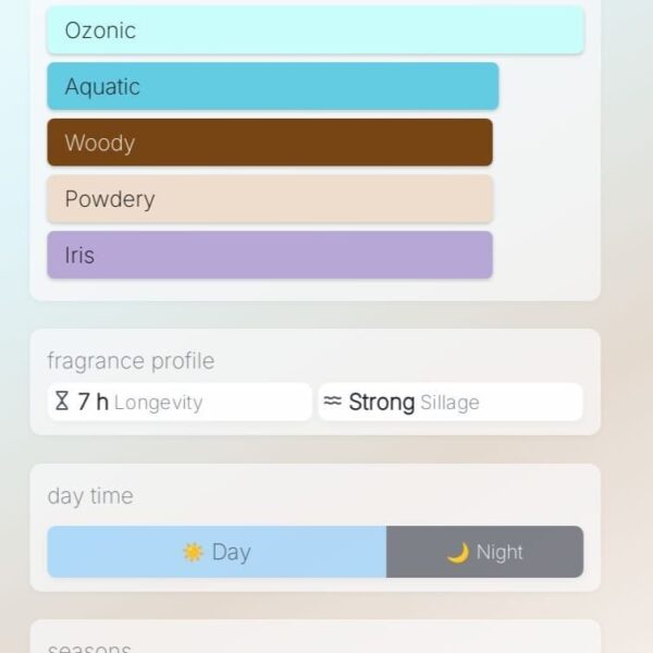 citrus, ozonic, woody, powdery, amber, iris, aquatic, violet, green, aromatic
