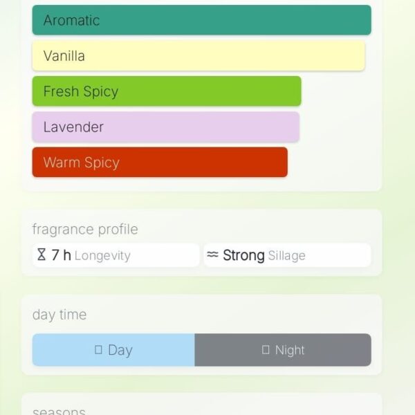 Top notes – Lavender, Mint, Cardamom, Bergamot, Artemisia
