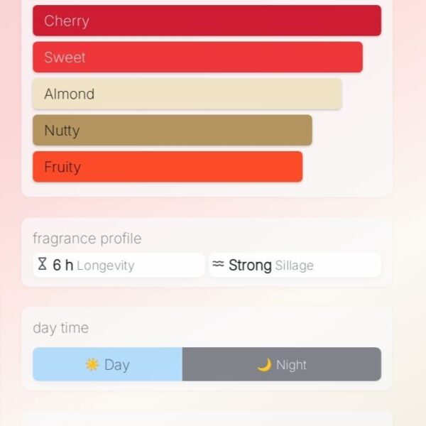 Middle notes – Sour Cherry, Plum, Turkish Rose, Jasmine Sambac